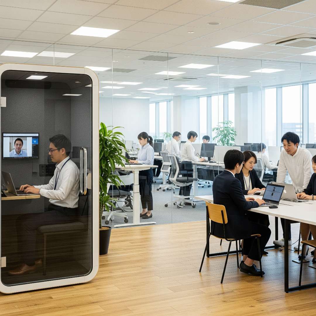 現代のオフィスで急増しているのが、Web会議をめぐる音の問題です。自席でのWeb会議は、周りの社員の集中を妨げ、話している本人も周りに気を使ってしまいます。この問題には、手軽に導入できる「個室ブース(フォンブース)」の設置が最も効果的です。1人用から数人用まで様々なタイプがあり、防音・吸音性に優れているため、周りを気にせず会議に集中できます。